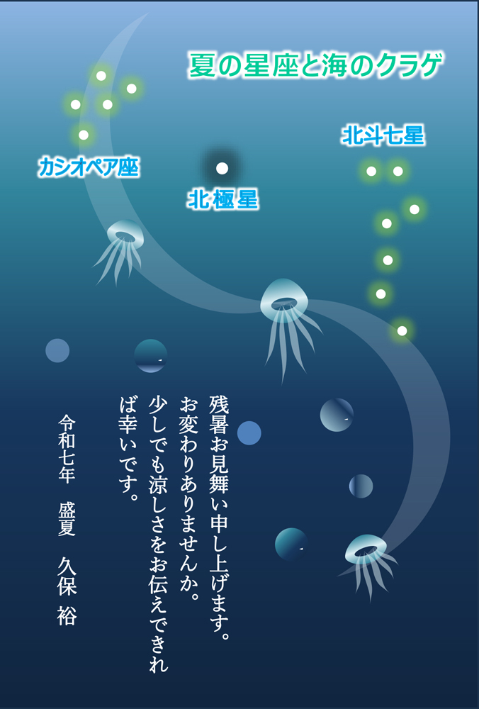 | 20250807zansho-mimai 残暑見舞いの葉書 ![]() 夜空と海中に浮かぶクラゲ パソコンのWordの図形のスタイル処理で描きました 詳細は「パソコン教室の窓から」8月号の記事を参照ください。 https://jyushin-rujyo.com/SpaceMagazine/85-202508.pdf |